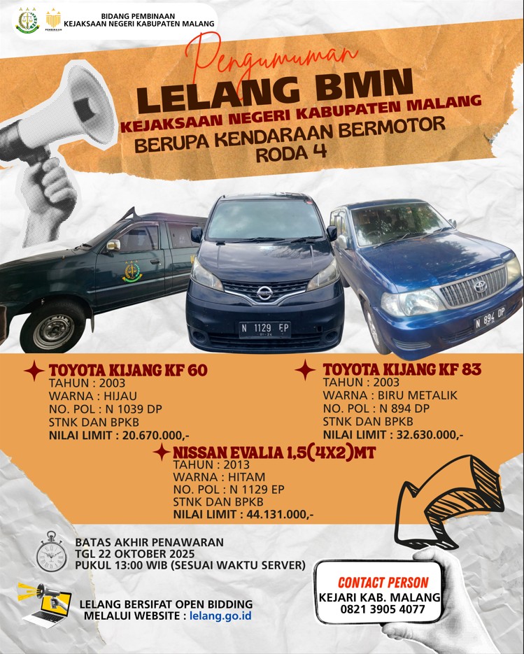Kejaksaan Negeri Kabupaten Malang kembali menggelar LELANG ONLINE melalui www.lelang.go.id ✅